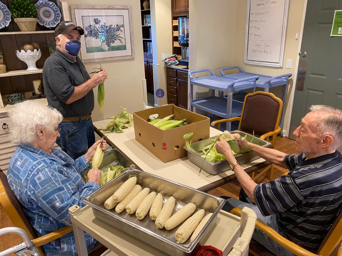 The residents had a great time helping to shuck corn for an upcoming meal!