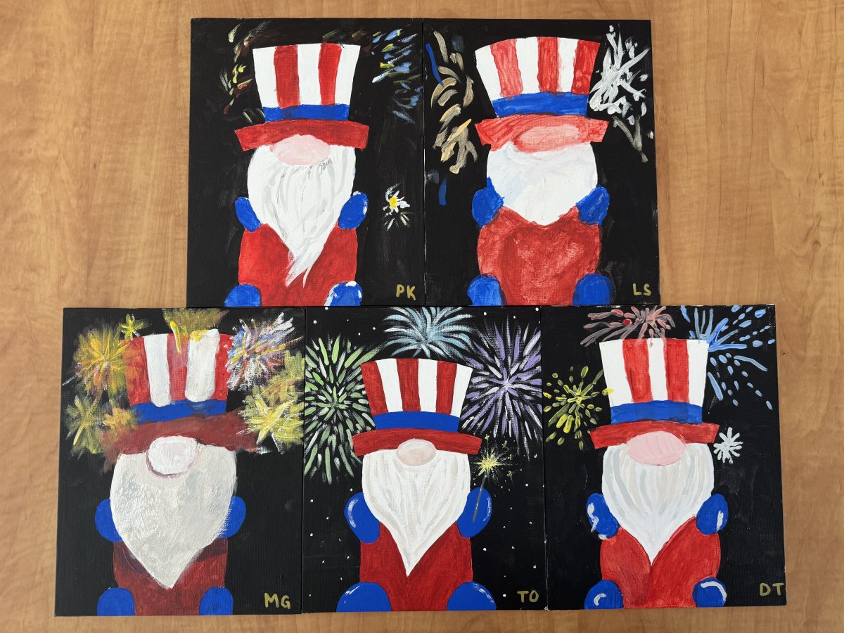Some of our residents have been busy this summer with creative crafts and paintings! So far we’ve crafted patriotic floral arrangements that brought a burst of red, white, and blue to our festivities. Our themed gnome paintings, adorned in Fourth of July colors, added a whimsical touch to the day. Inspired by the vibrant style of Paul Gauguin, we also painted palm tree scenes, capturing the essence of summer with bold, lively colors.