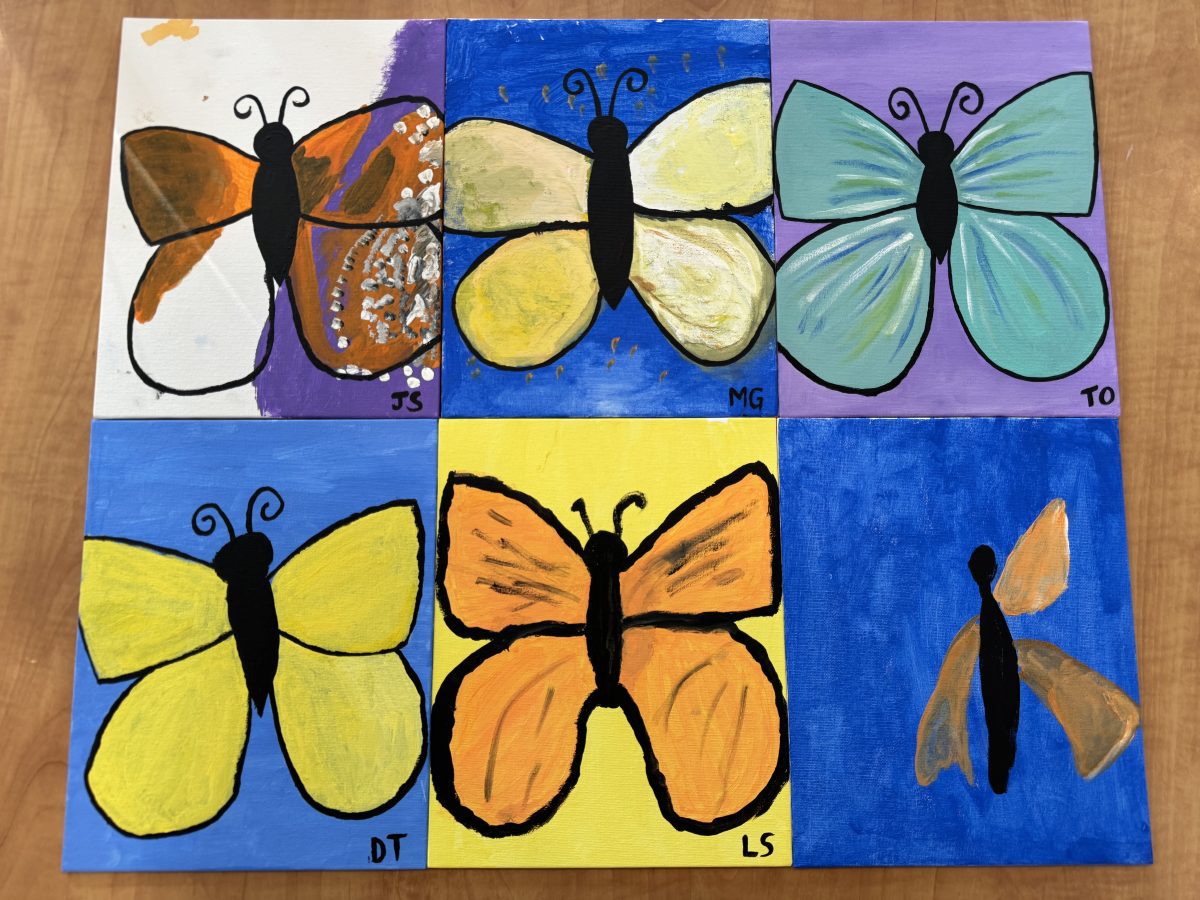 In light of our June butterfly release and summer weather, we created a few celebratory art pieces! We honored our butterflies with acrylic paintings and filter butterflies. And to ring in the hot temperatures, we pretended we were in a tropical oasis – or rather just painted it! With the late Keith Haring’s birthday being recently, we also learned about him and the beautiful and meaningful art he created. We made some of our own Haring inspired art with a Roll-A-Haring dice and drawing game!