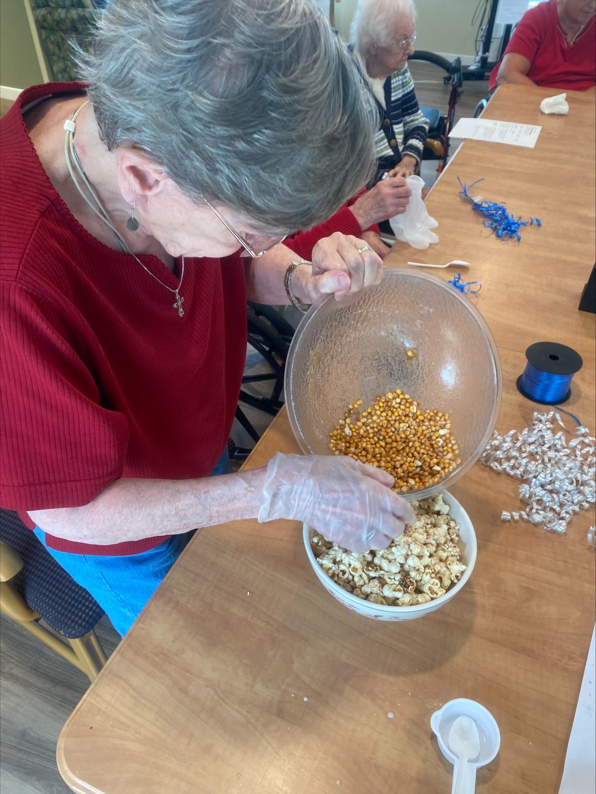 During our recent cooking class, the residents had a delightful time making cinnamon butter popcorn. With enthusiasm, they measured out the ingredients and took turns stirring the buttery mixture infused with a hint of cinnamon. The aroma filled the room, creating a cozy atmosphere. Once the popcorn was tossed in the sweet blend, everyone gathered to taste their creation, and the smiles on their faces said it all.